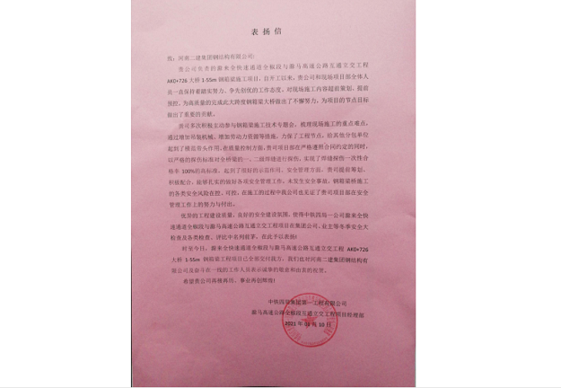 中铁四局集团第一工程有限公司向开云网页版-kaiyun开云(中国) 发来表扬信